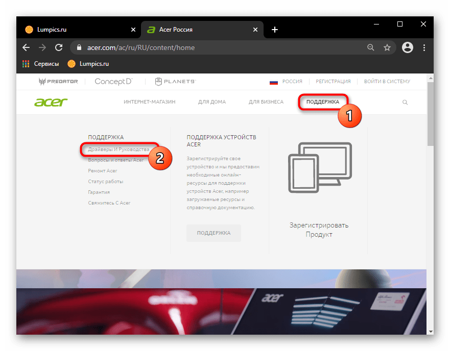 - Откройте ссылку выше, наведите курсор на раздел «Поддержка» и перейдите в категорию «Драйверы и Руководства».