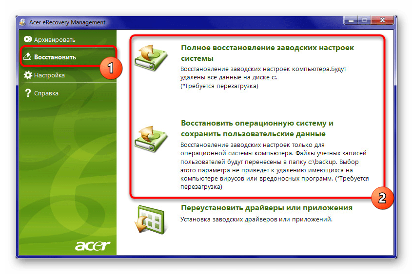 В случае, когда воспользоваться фирменным софтом от Эйсер не удается, вам остается лишь выполнить весь сброс самостоятельно. Эта процедура включает в себя сброс до заводских настроек операционной системы ее же средствами и, на свое усмотрение, сброс BIOS.