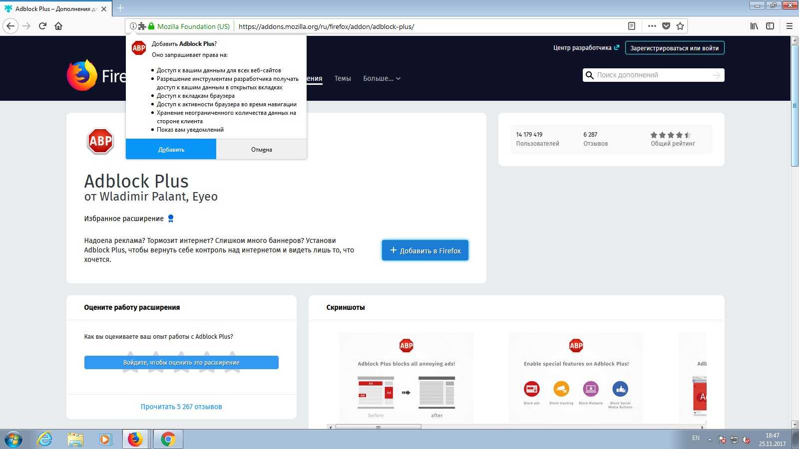 Adblock Plus является самым популярным в мире расширением для браузеров (более 200 миллионов скачиваний). При установке Adblock Plus для Google Chrome ваш браузер покажет предупреждение о том, что расширение имеет доступ к вашей истории посещений и личным данным.