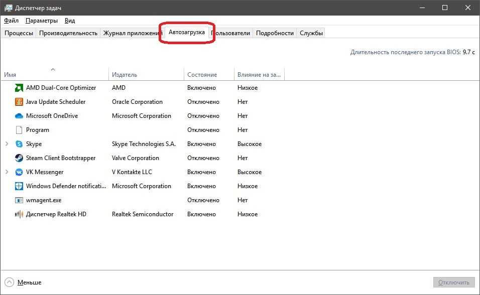 В диспетчере задач на вкладке «Автозагрузка» вы выбираете каждый элемент отдельно и отключаете его. Вы не можете выбрать их все сразу по какой-то причине.