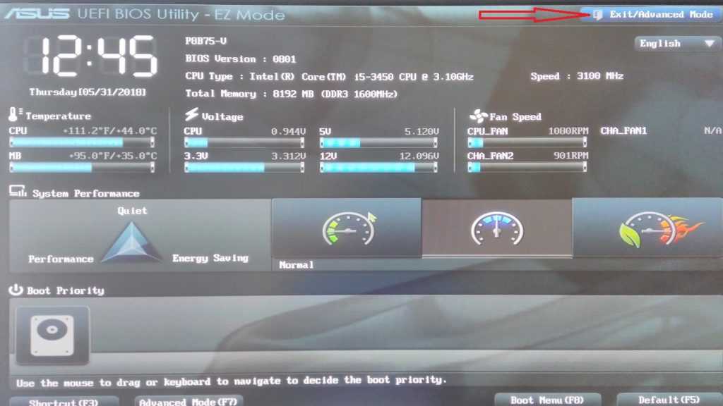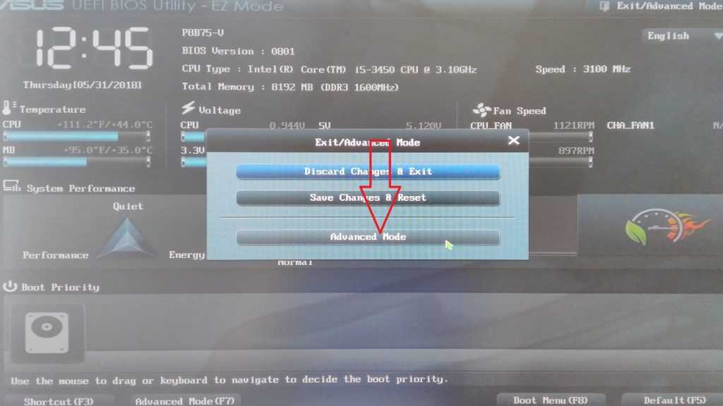 жму и попадаю в UEFI, интерфейс у всех производителей более-менее стандартизирован и построен по одному принципу, сразу после входа в UEFI вы попадаете на информационный экран с общими данными о компьютере и показаниями основных параметров температур, напряжений и т. п. Тут можно сразу пройти в меню Boot Priority и все настроить, но мы пойдем по старинке — ищем способ переключения в расширенный режим, обычно либо есть соответствующая кнопка (на картинке ниже указана стрелкой), либо внизу указана клавиша с помощью которой можно перейти в Advanced Mode в нашем случае F7, жмем: