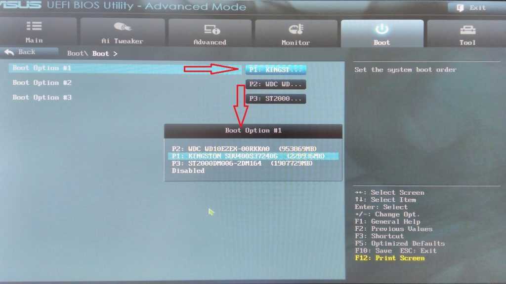 и настраиваем приоритет загрузки, выбирая из выпадающего меню напротив каждого пункта Boot Option нужный жесткий диск: