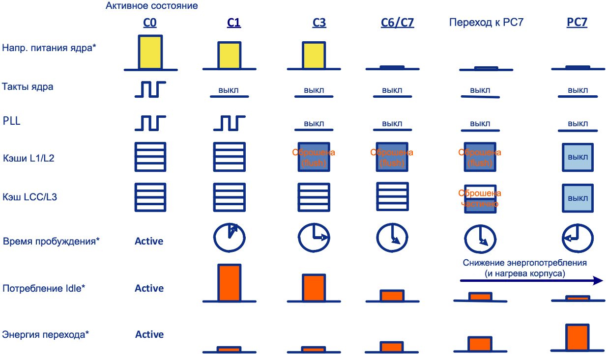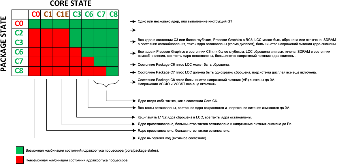 Примечание: “состояние ядра” (core state) относится к ядру, которое находится в состоянии самого большого потребления энергии (наиболее активно).