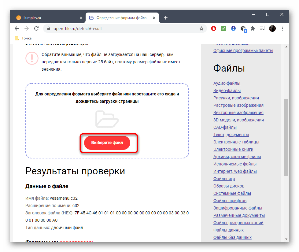 Онлайн-сервис под названием Open File позволяет не только определить формат файла, но и получить более детализированную информацию по нем, в том числе и узнав, с какой вероятностью он применяется в тех или иных сферах. Еще одно достоинство этого инструмента в том, что он загружает только первые 25 байт объекта, а значит, процесс обработки пройдет одинаково быстро вне зависимости от того, какой объем имеет файл.