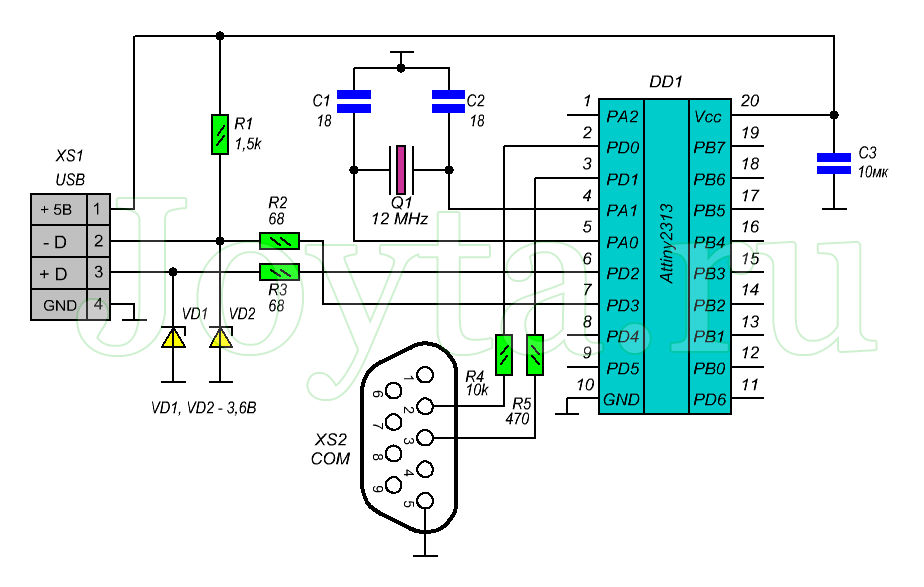 Питание микроконтроллера Attiny2313 осуществляется непосредственно от шины питания USB. Вся схема собрана на односторонней плате (SMD и ТН варианты). Устройство поддерживает только сигналы Rx и Tx.
