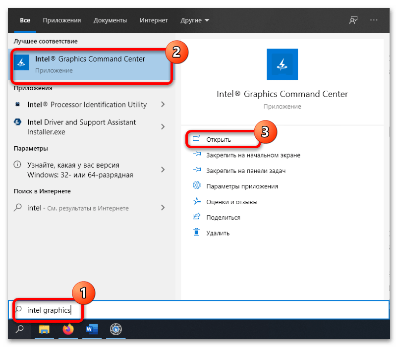 Нажмите на иконку средства или текстовую строку на панели задач. Введите запрос intel graphics – должен появиться соответствующий результат, по которому нужно кликнуть для открытия.