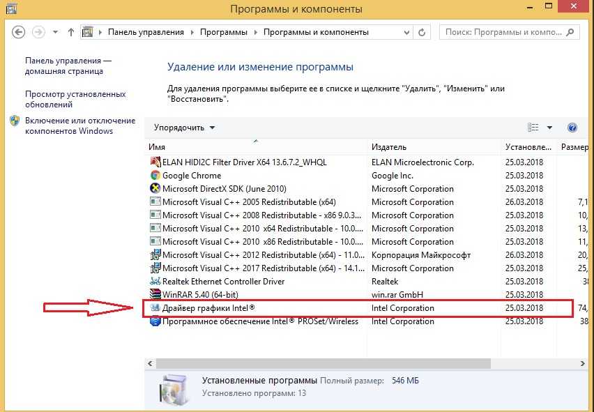 Далее, идем: Пуск > Панель управления > Программы > Удаление программы и в списке находим Драйвер HD-графики Intel, нажимаем на этой позиции правую кнопку мыши и выбираем пункт: Удалить.