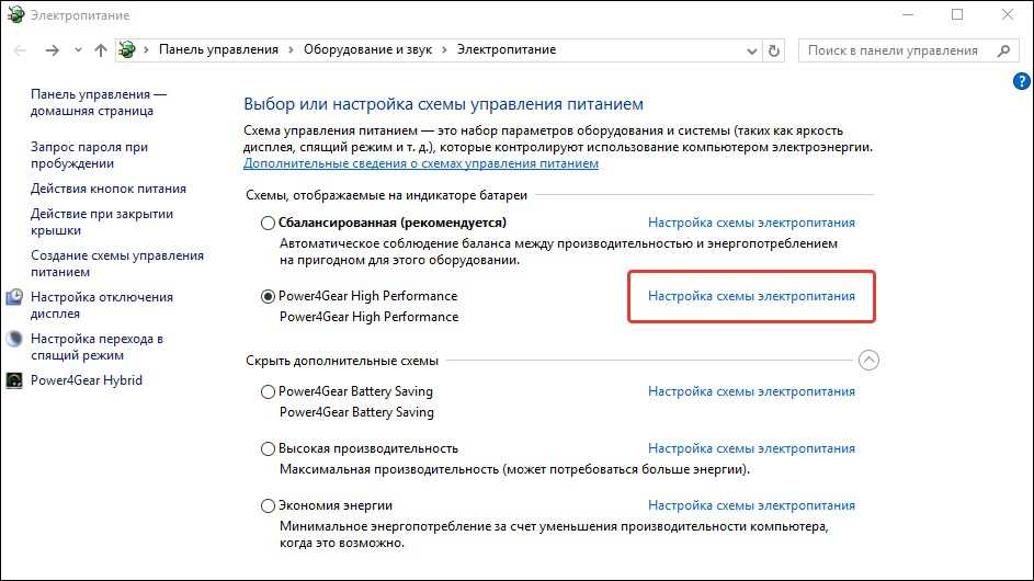 Настройка плана энергосбережения
