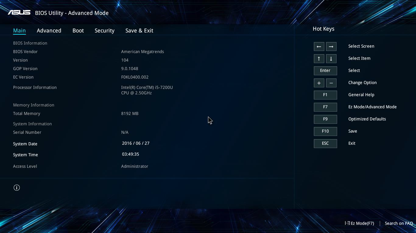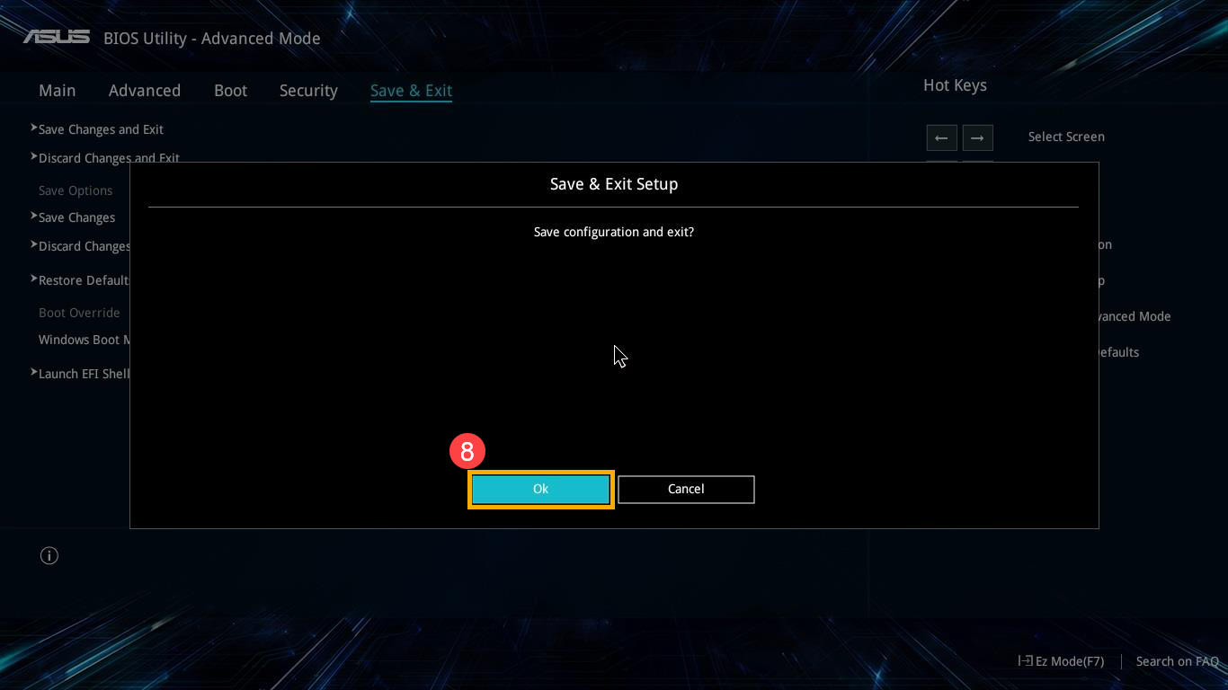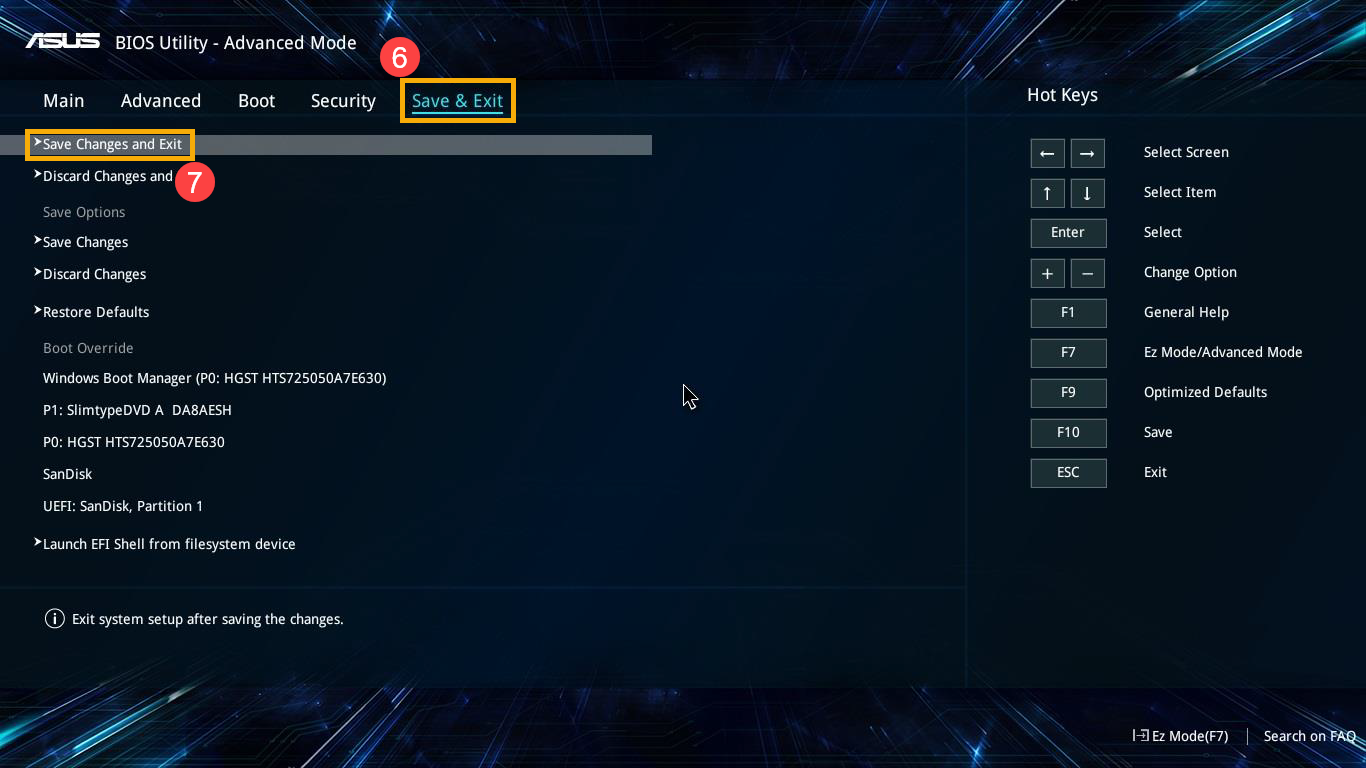 1. Перезапустите ПК. Нажмите клавишу «Del» или «F2» (зависит от конкретной модели ASUS). Когда на дисплее отобразится оболочка, нажмите «F7», отобразится «Advanced Mode».