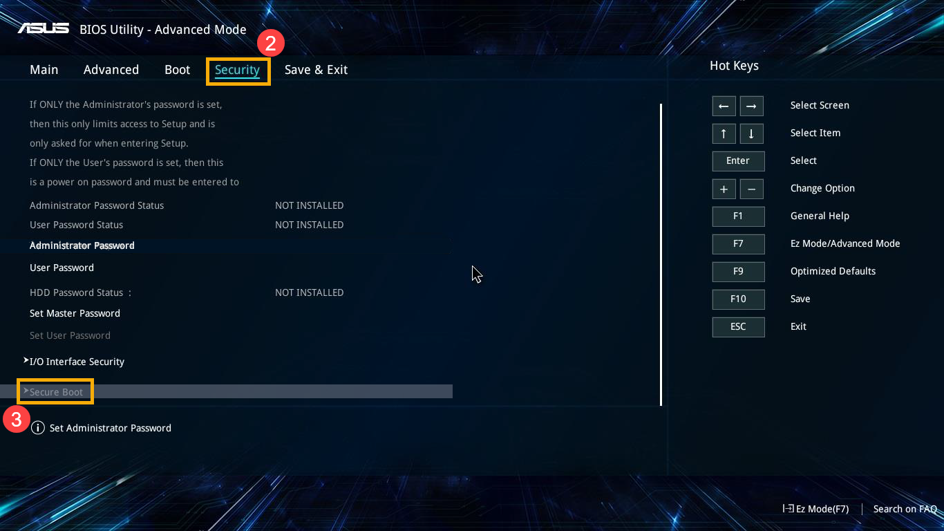 1. В UEFI откройте «Security» (иконка «Щит» в верхнем меню).