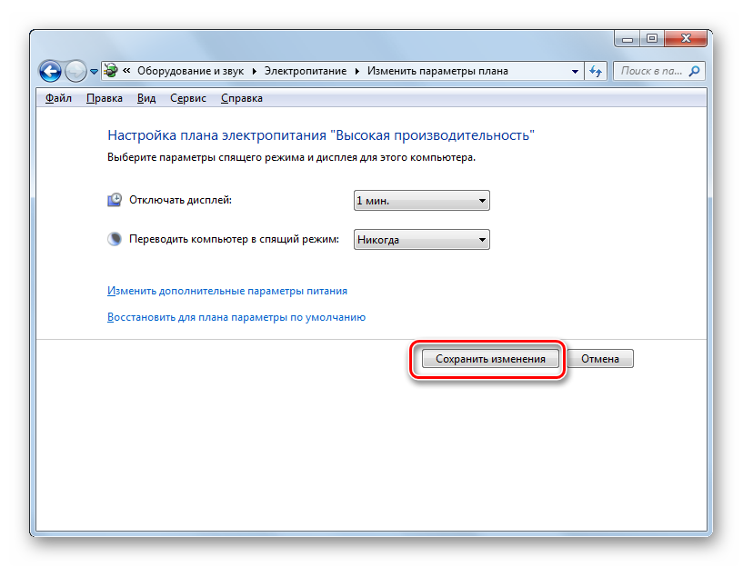 - Открывается уже знакомое нам по предыдущему способу окно параметров плана энергопитания. В поле «Переводить компьютер в спящий режим» остановите выбор на пункте «Никогда» и жмите «Сохранить изменения».