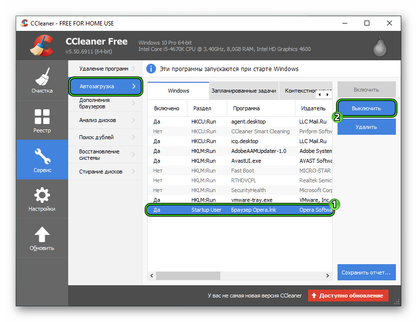 Последний способ – через приложение CCleaner, предназначенное для оптимизации и очистки ПК от мусора. Скачать утилиту можно на нашем сайте. Чтобы убрать автоматический запуск, платная версия не требуется. После инсталляции следует перейти в раздел «Сервис», оттуда – в подраздел «Автозагрузка». Нужно найти в списке Оперу, кликнуть по ней, в меню справа нажать «Удалить».