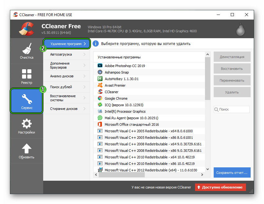 Теперь вам нужно стереть с компьютера все программы, которыми вы никогда не пользовались. Для этих целей идеально подходит утилита CCleaner. Просто зайдите в «Сервис – Удаление программ» и деинсталлируйте все лишнее.