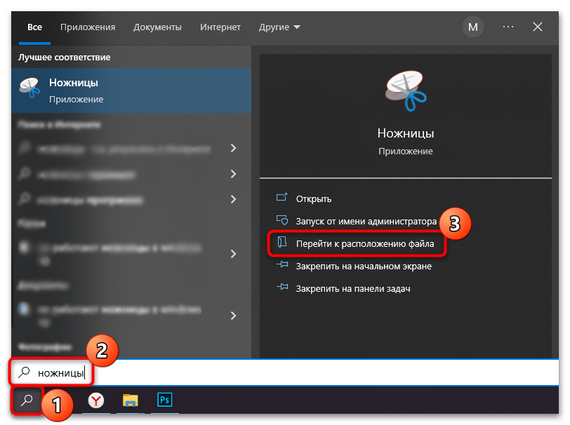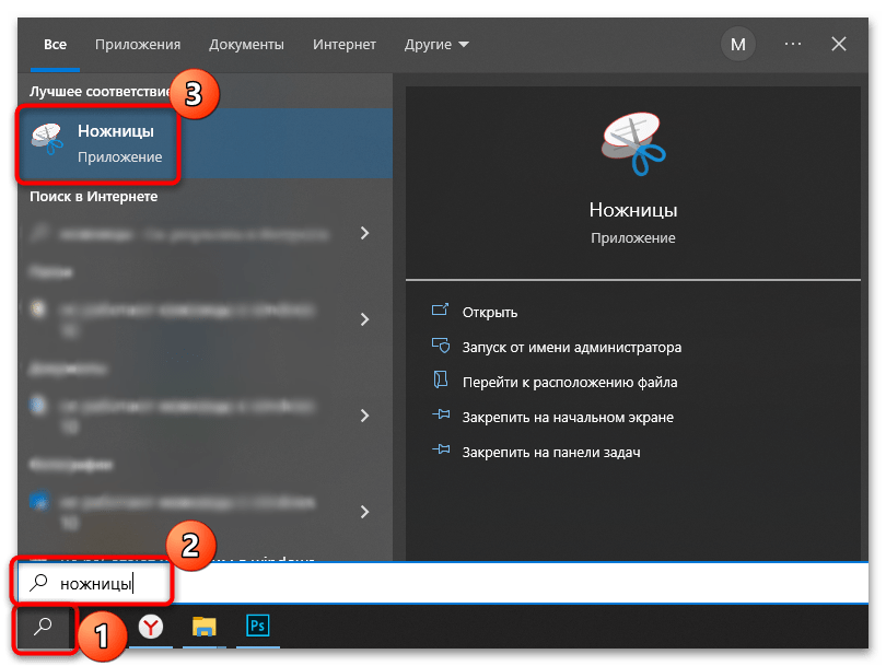По умолчанию штатное средство «Ножницы» располагается в главном меню Windows 10, и запустить его можно с помощью системной поисковой строки. Разверните «Пуск» и начните набирать название скриншотера. В меню отобразится наиболее подходящий результат – щелкните по нему.