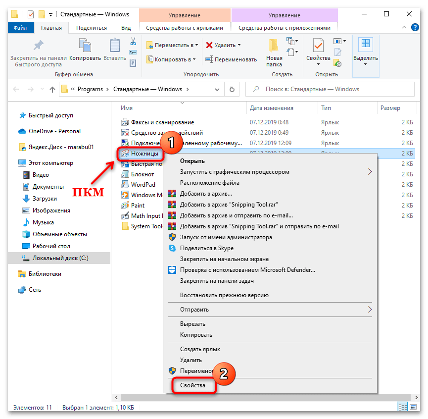 В окне «Проводника» вы увидите список ярлыков штатных инструментов. Найдите в нем «Ножницы», кликните по этому названию ПКМ и из контекстного меню выберите «Свойства».