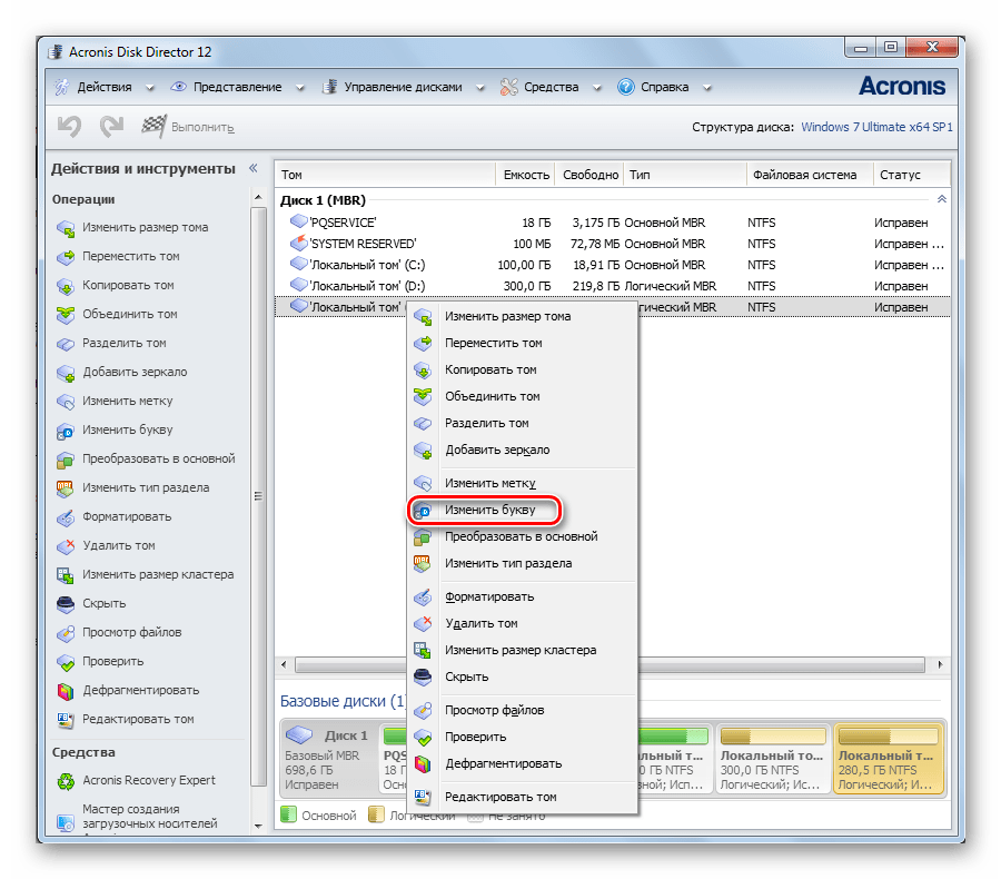 - Запустите программу и подождите несколько секунд (или минут, в зависимости от количества и качества подключенных устройств). Когда появится список, выберите необходимый диск. Слева есть меню, в котором нужно нажать «Изменить букву».
