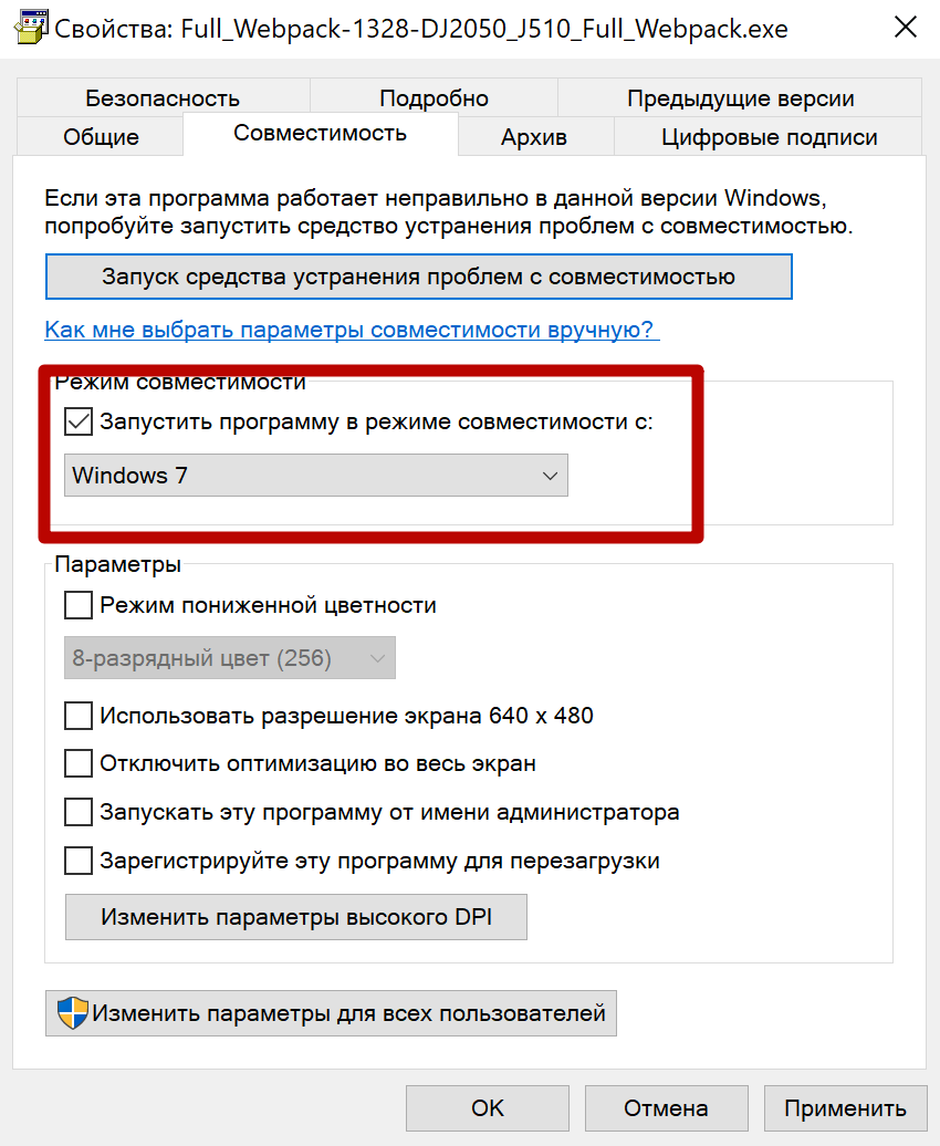Если же драйвер не смог установиться, то можно попробовать выбрать режим совместимости. После скачивания файла кликните по нему правой кнопкой мышки, выберите «Свойства». Далее перейдите на вкладку «Совместимость», поставьте галочку в строке «Запустить программу в режиме совместимости» и выберите вашу версию Windows.