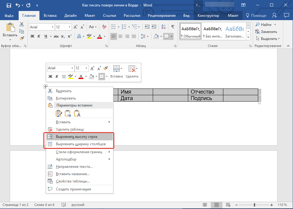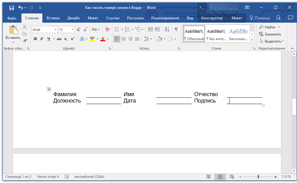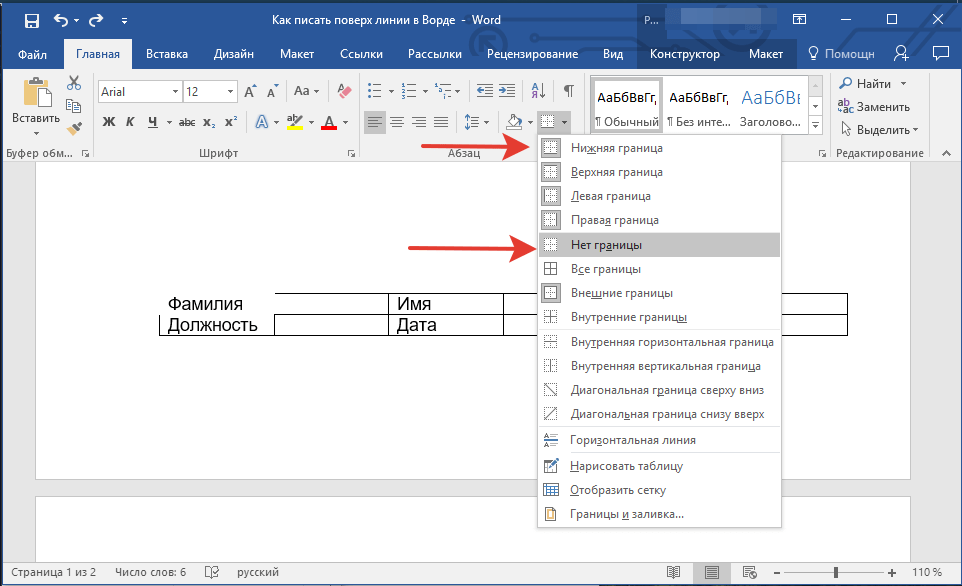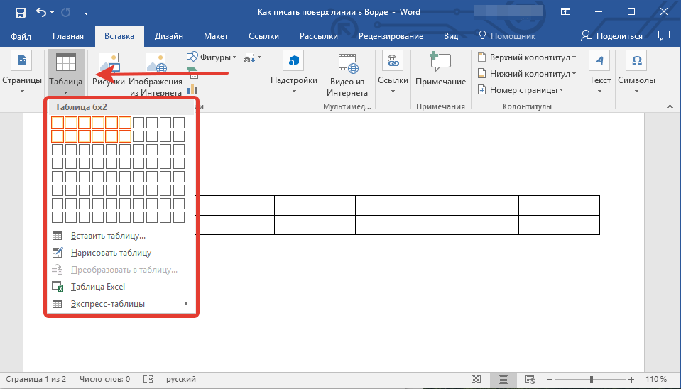 Как писать в ворде над чертой без сдвига с помощью таблицы?