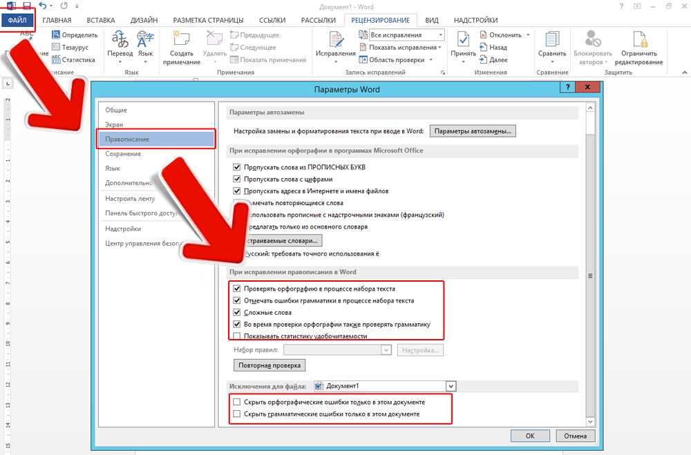 - Уберите галочку в «Автоматически проверять орфографию» или отметьте «Скрыть ошибки только в этом документе». Автопроверка перестанет вам докучать. Но искать опечатки будет сложнее.