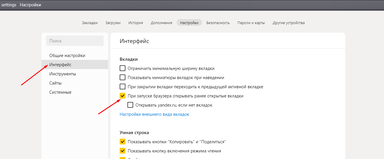Далее перейду в категорию «Интерфейс» и найду раздел «Вкладки». Ниже будет несколько пунктов, в числе которых «При запуске браузера открывать ранее открытые вкладки». Просто поставлю напротив него галочку.