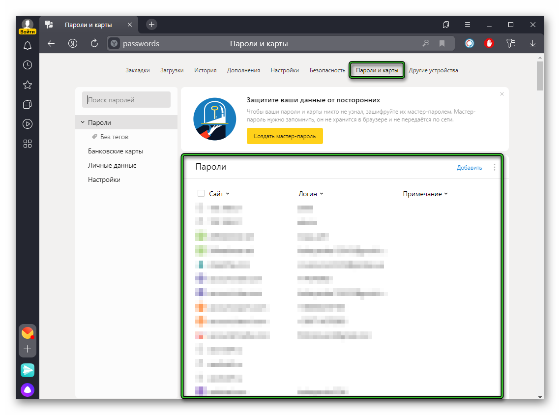 Перейдите к блоку «Пароли и карты зашифрованы».