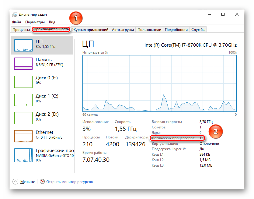 Вы пользуетесь Windows 8, 8.1 или 10? Обратитесь к вкладке «Производительность». Внизу есть строчки «Ядра» и «Потоки» — те числа, которые вас интересуют.