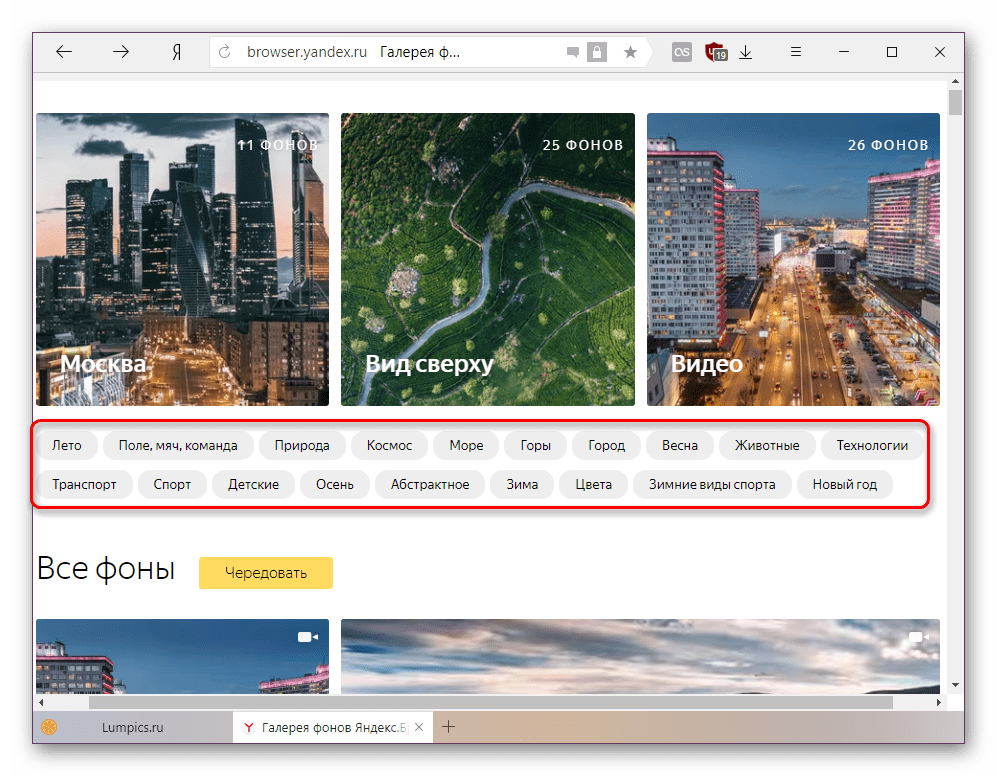 После выполнения каждого из обозначенных ваше действий, откроется галерея фонов. Именно здесь пользователю предстоит выбрать один из предусмотренных Яндексом вариантов оформления стартовой страницы.