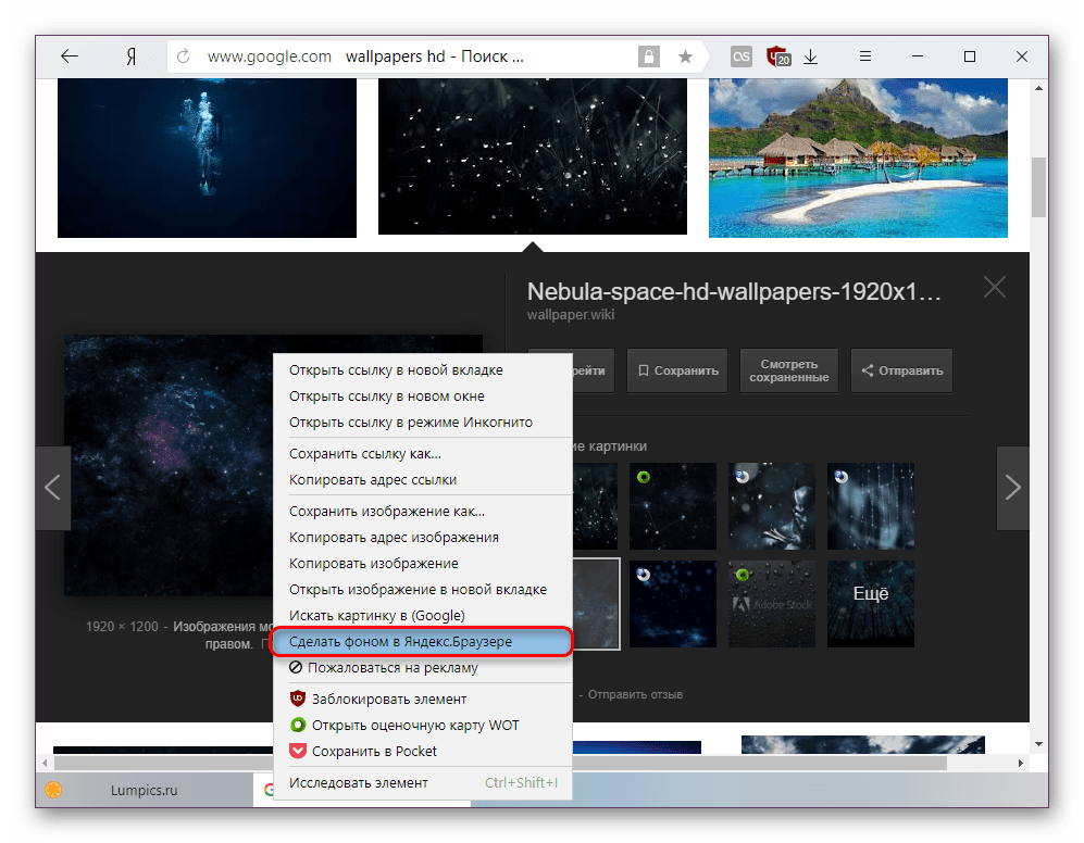 заключается в использовании контекстного меню. Предположим, вы нашли картинку, которая вам понравилась. Ее даже не нужно скачивать на ПК, а затем устанавливать через настройки Яндекс.Браузера. Просто нажмите по ней правой кнопкой мыши и из контекстного меню выберите «Сделать фоном в Яндекс.Браузере»