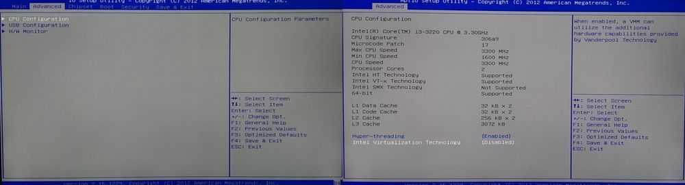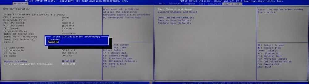 Перейти во вкладку «Advanced» – «CPU Configuration». Найти пункт «Virtualization Technology», «Vanderpool Technology», «VT Technology» или «Virtualization».