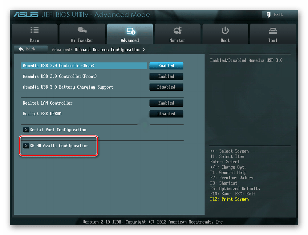Здесь нужно будет выбрать параметр, который отвечает за функционирование звуковой карты. Данный пункт может носить разные наименования, в зависимости от версии BIOS. Всего их можно встретить четыре — «HD Audio», «High Definition Audio», «Azalia» или «AC97». Первые два варианта являются самыми распространёнными, последний встречается только на очень старых компьютерах.