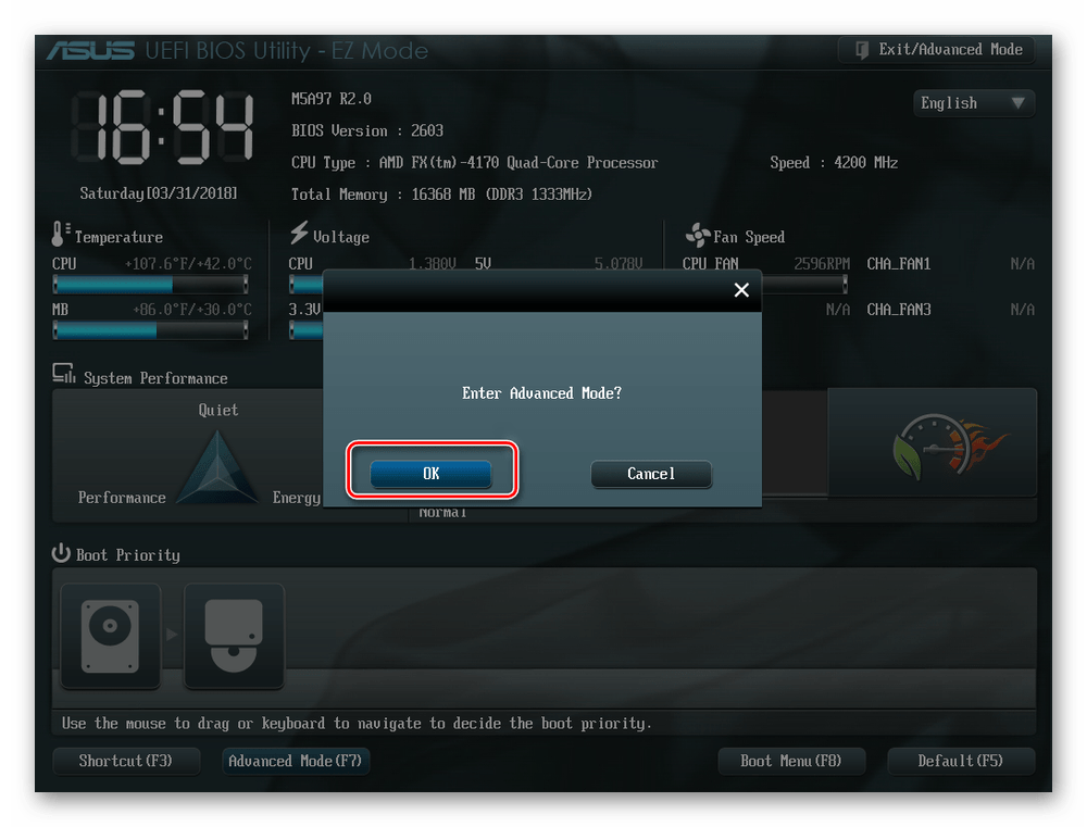 - В нижней части экрана UEFI нажмите «Advanced Mode» и подтвердите вход в раздел расширенных настроек;