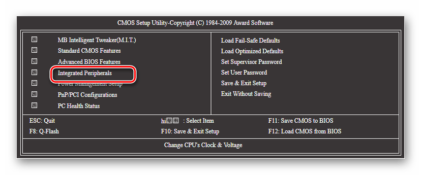 В Award Bios все совсем по другому. Здесь после входа в биос вы увидите примерно вот такое окно. Нас интересует пункт меню “Integrated Peripherals”.
