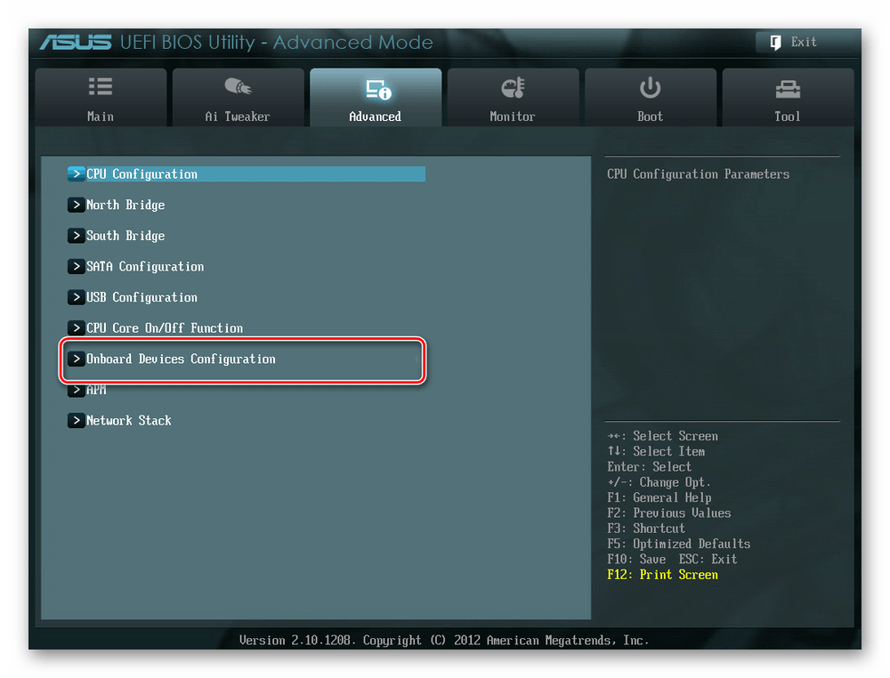- Переключитесь на одноименную вкладку «Advanced» и выберите на ней подраздел «OnBoard Devices Configuration»;