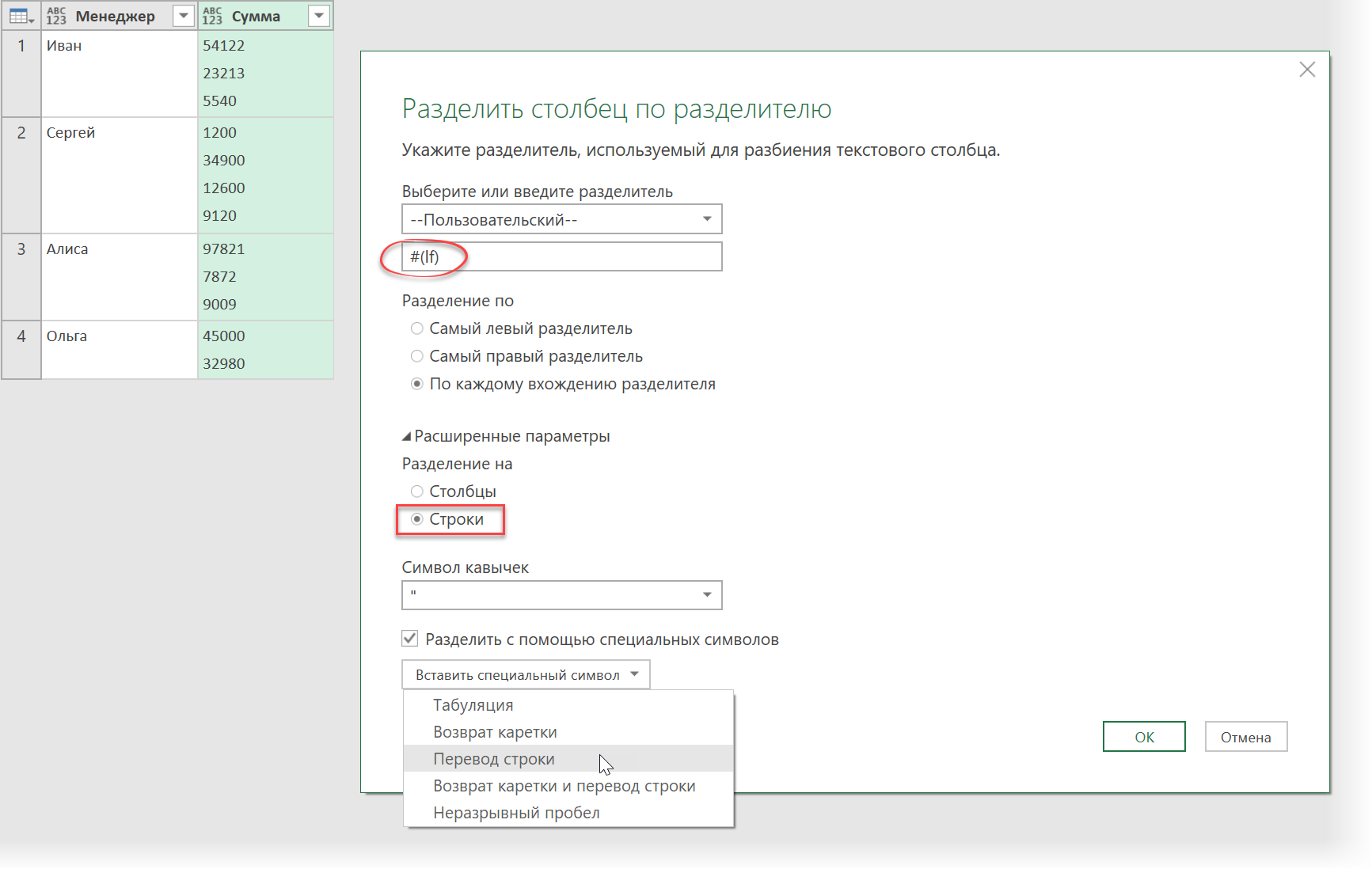 Функция «сцепить()» похожа на предыдущую. Она тоже задается формулой, но в скобках указывается не код, а формула «символ(10)».