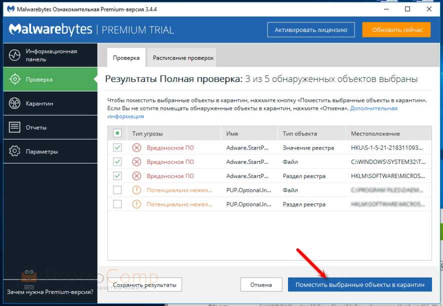 В итоге скачал Malwarebytes Free. Запустил и начал наблюдать за процессом сканирования. Было найдено три угрозы «Вредоносное ПО» (Adware.StartPage) и две «Потенциально нежелательные программы». Выделил только «Вредоносное ПО» и отправил в карантин.