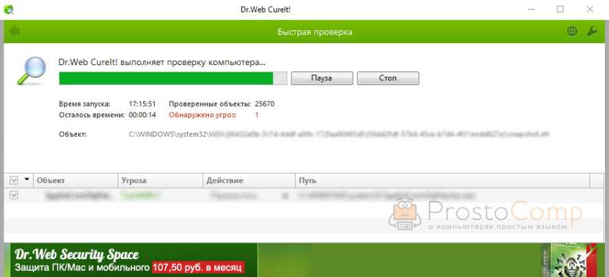 Дальше скачал Dr.Web CureIt! и запустил проверку. Но он вообще ничего не нашел. То что вы видите на скриншоте ниже, это точно не рекламный вирус.