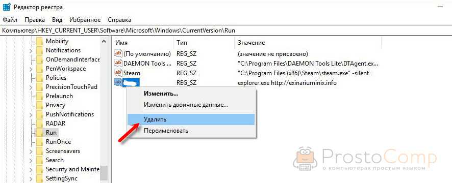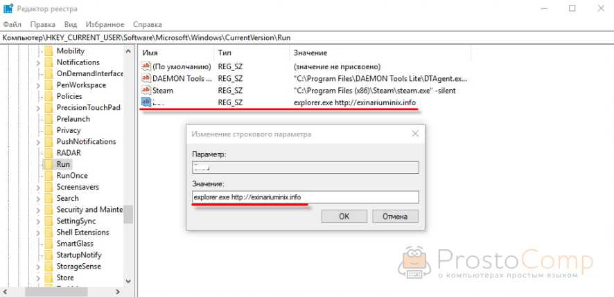 В редакторе реестра ключ с параметром «explorer.exe http://exinariuminix.info» исчез и больше не появляется. Точно так же как и «Проводник» в окне «Автозагрузка».
