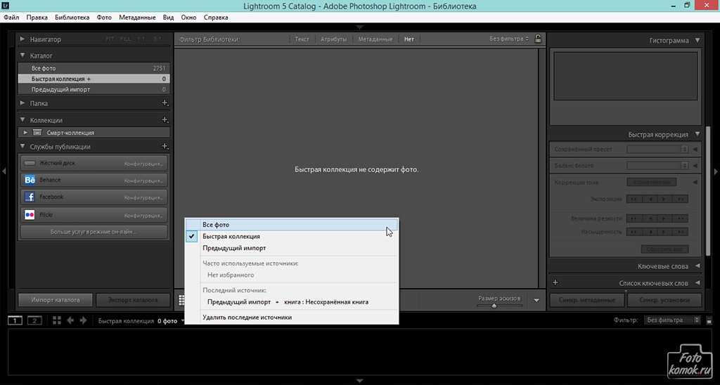 Стоит отметить, что Lightroom открывает не только формат RAW, но и JPEG. Воспользовавшись функцией «Все фото» внизу рабочего поля у нас появятся превью всех фотографий, которые Вы когда-либо сделали и сбросили из фотоаппарата на компьютер. Если Вас это не устраивает, то можно стать левой кнопкой мыши на одно из превью и во вкладке «Фото» и внизу списка выбрать «Убрать фото из каталога».