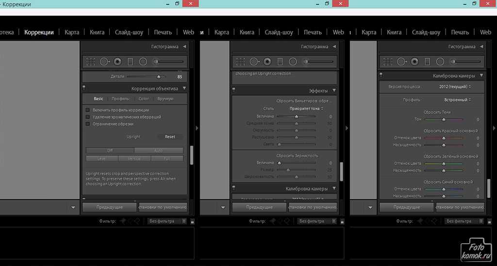 Далее идут разделы узкой специализации: «Коррекция объектива», «Эффекты», где можно настроить эффект виньетки, и «Калибровка камеры».