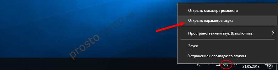 Я рекомендую начать с проверки устройств воспроизведения. Возможно, в настройках Windows 10 нужно просто сменить динамики на наушники. Нажмите правой кнопкой мыши на значок звука в трее и выберите «Открыть параметры звука».