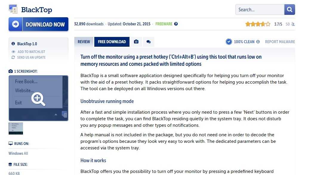 Приложение, предлагающее такую же функцию выключения дисплея, но при этом имеющее дополнительные возможности. После установки BlackTop владелец компьютера может воспользоваться двумя способами отключения: