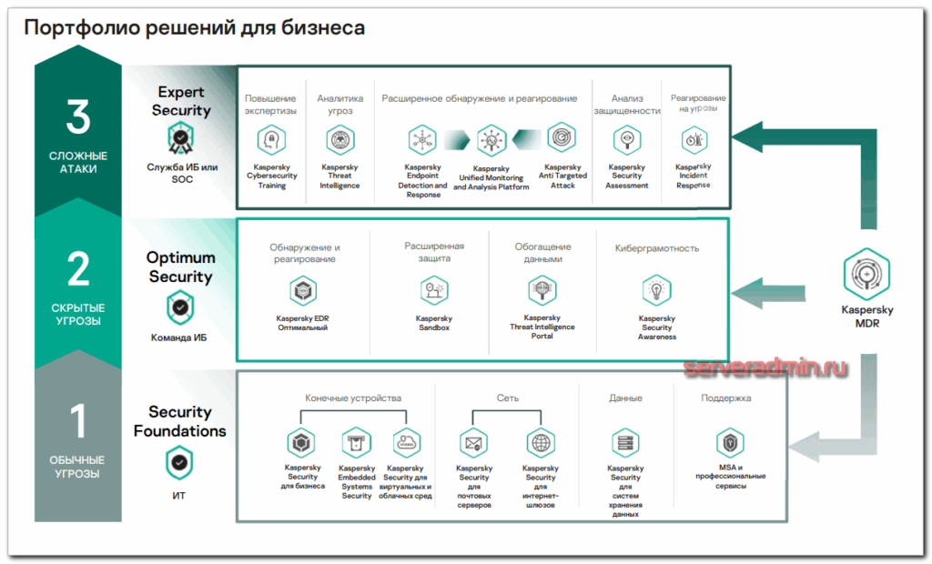 Для удобного подбора комплексной защиты «Лаборатория Касперского» сгруппировала все свои продукты кибербезопасности в 3 уровня для того, чтобы вы смогли подобрать себе линейку продуктов под свои задачи и ресурсы.