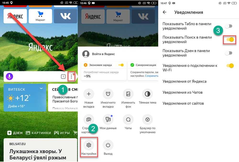 В настройках веб-обозревателя имеется интересная опция, позволяющая вывести строку поиска не на рабочий стол, а в панель уведомлений. Это может быть даже удобнее, поэтому предлагаем ознакомиться с инструкцией по активации функции:
