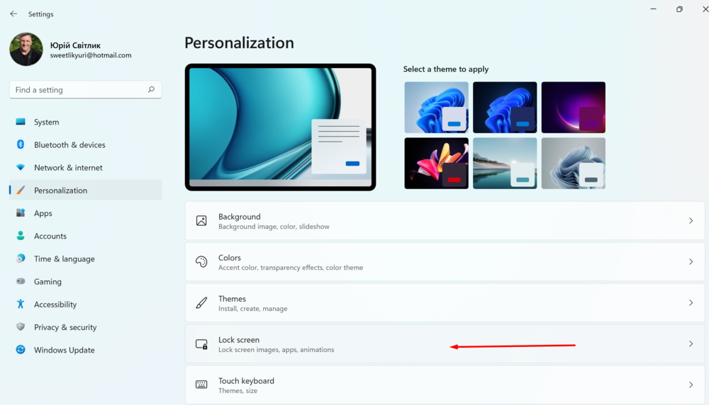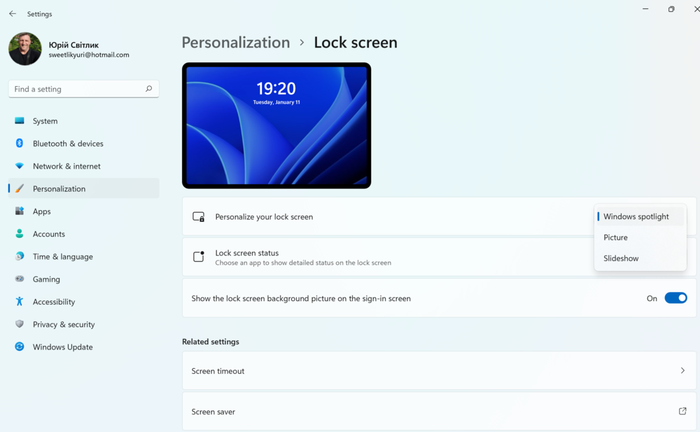 Если хотите настроить экран блокировки на свой вкус, то это тоже достаточно легко сделать. Просто перейдите в раздел Экран блокировки. Здесь вы можете выбрать, какая картинка будет на экране блокировки. На выбор есть набор картинок от Windows, показ слайдов, и есть возможность установить собственную картинку.