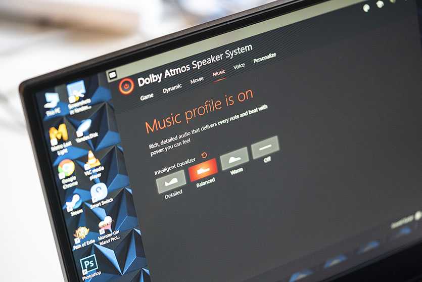 Динамики мощностью 2 Вт расположили по обе стороны нижней грани ноутбука для получения приличного звука. Они сами по себе ничем особенным вас не удивят, но с помощью программы Nahimic Audio доступна масса настроек. Вы можете настроить их для музыки, фильмов, чатов или игр; есть заметная разница со всеми предыдущими настройками, и вы можете внести много дополнительных изменений в каждой из них.