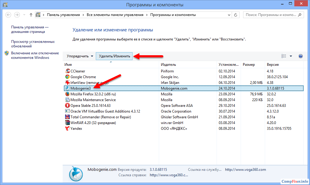 Выделите программу Mobogenie и нажмите Удалить/Изменить: