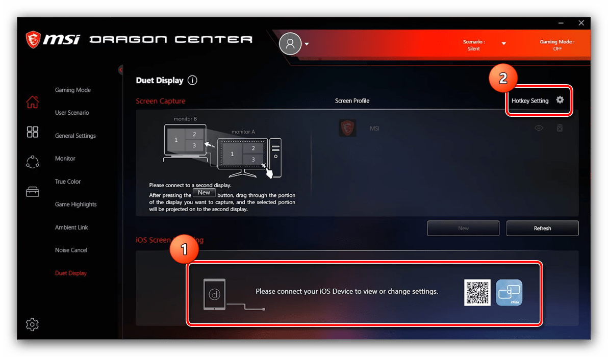 В этой вкладке можно соединить iOS-устройство и продублировать экран на него (понадобится установить приложение-компаньон), а также настроить горячие клавиши доступа – кликните по кнопке «Hotkey Settings» и задайте нужное сочетание.