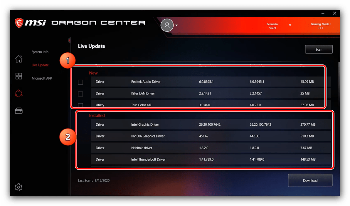 - Нажмите на кнопку «Scan», чтобы приложение проверило, какой софт нуждается в обновлении. По завершению сканирования поставьте галочки напротив нужных позиций в разделе «New», затем кликните «Download».