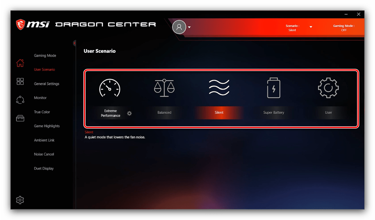- Silent Mode – позволяет максимально снизить шум от вентиляторов, но при этом держать уровень производительности на достаточном уровне.