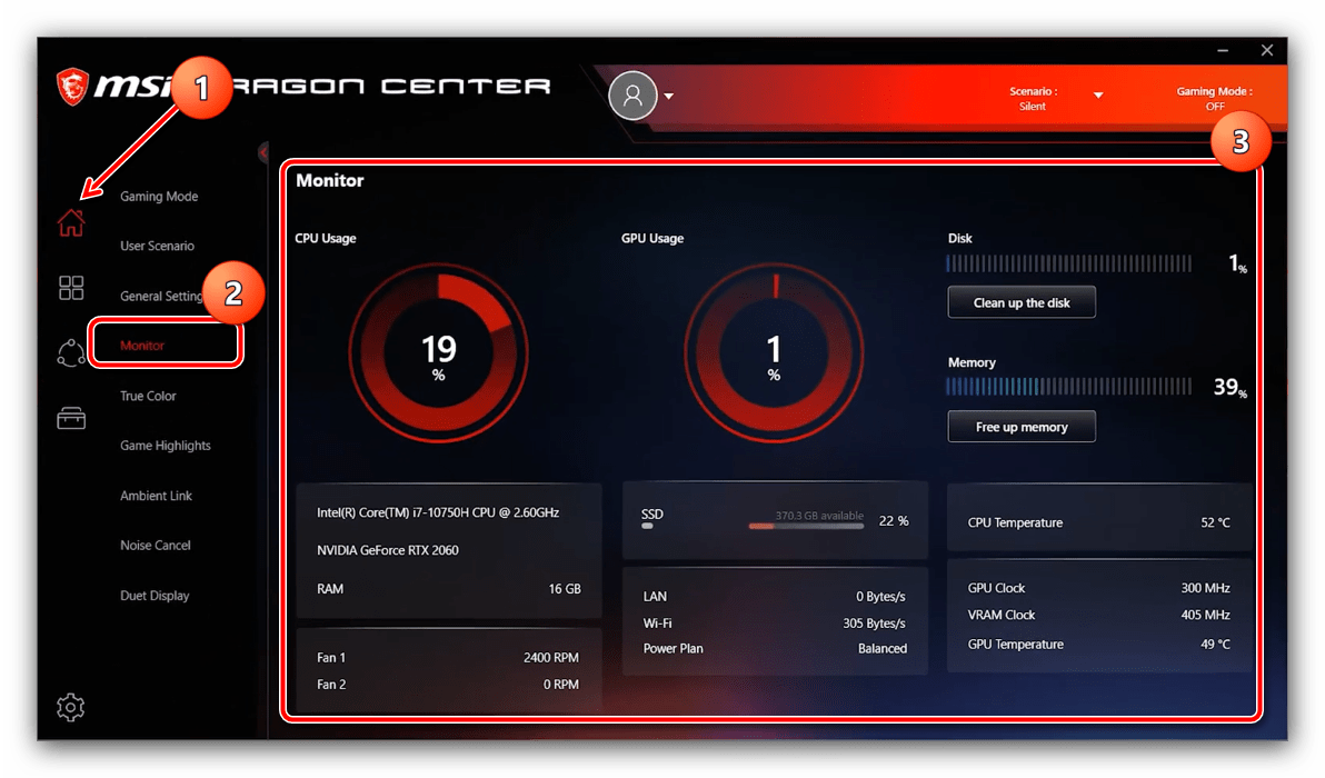 Приложение MSI Dragon Center позволяет отслеживать и при необходимости оптимизировать производительность Вашей системы. Буквально в несколько нажатий можно изменить пользовательский сценарий, цветовой режим дисплея, звуковой эффект, настроить подсветку и многое другое.
